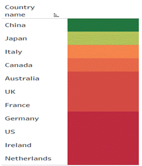 Figure 1 depicts the cost of living comparison using a colour map, with green being the cheapest countries to live in and red the most expensive. As can be seen, China and Japan are the least expensive and Netherlands, Ireland, and the U.S the most expensive. The UK is in the middle of the group but is still significantly more expensive to live in than China and Japan.